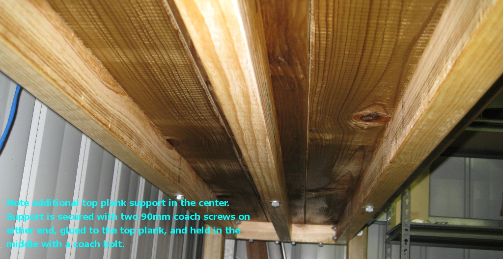 - Since you’re now adding a plank in the middle, that plank will have no support beam. Get an extra 70x45x1800mm under bench support.