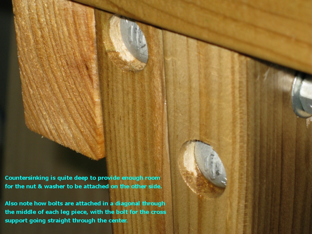 - Given that you arent’ going to be housing the cross supports into the legs, the total thickness of leg + cross support will be 115mm - too long for the 120mm coach bolts you’ll be getting. You have two choices - get longer coach bolts, or do what I did and counter-sink the head of the coach bolt. In order to do this, use a 22mm wood boring bit and drill in about 5-7mm, then finish off the hole with the 10mm wood boring bit. That provides enough room for the head of the coach bolt to get in and lets you attach the washer + nut on the other end.